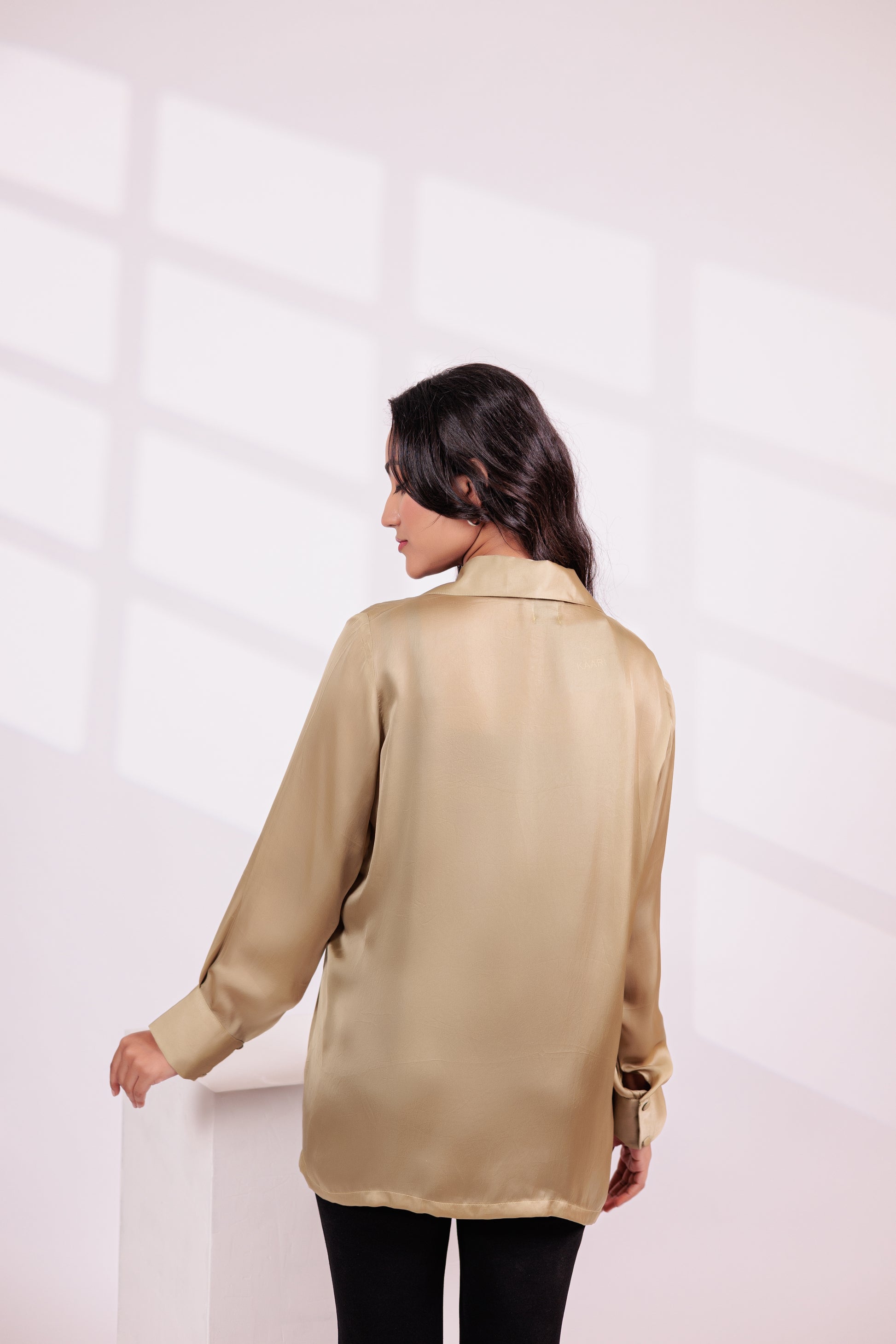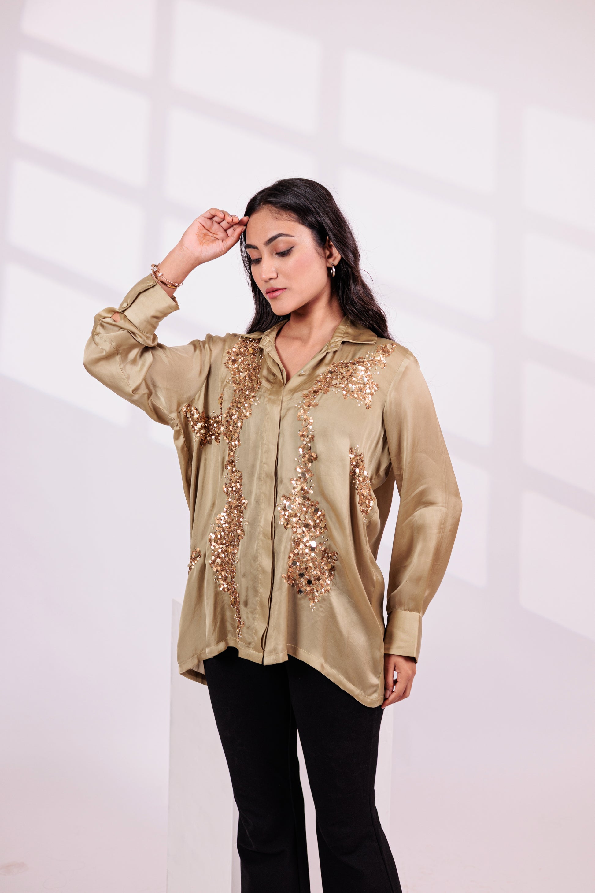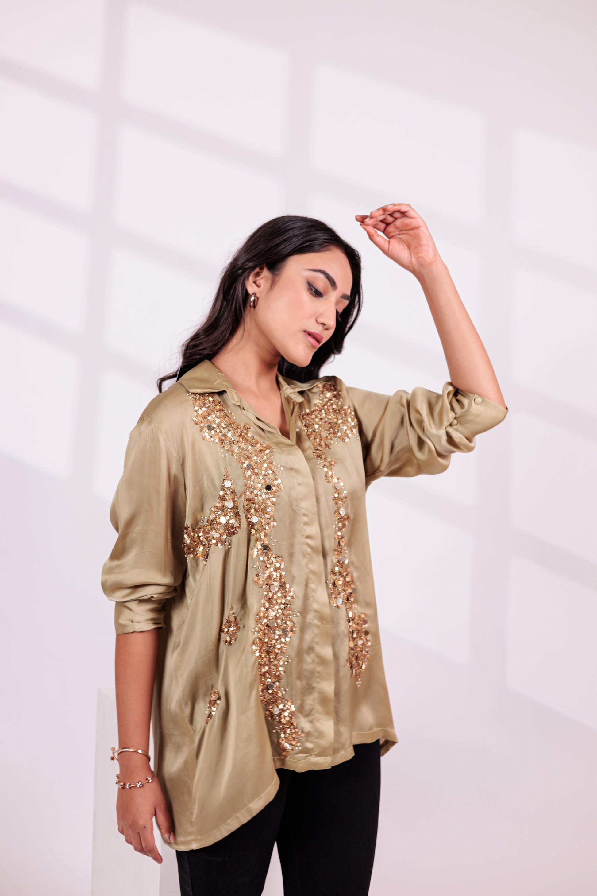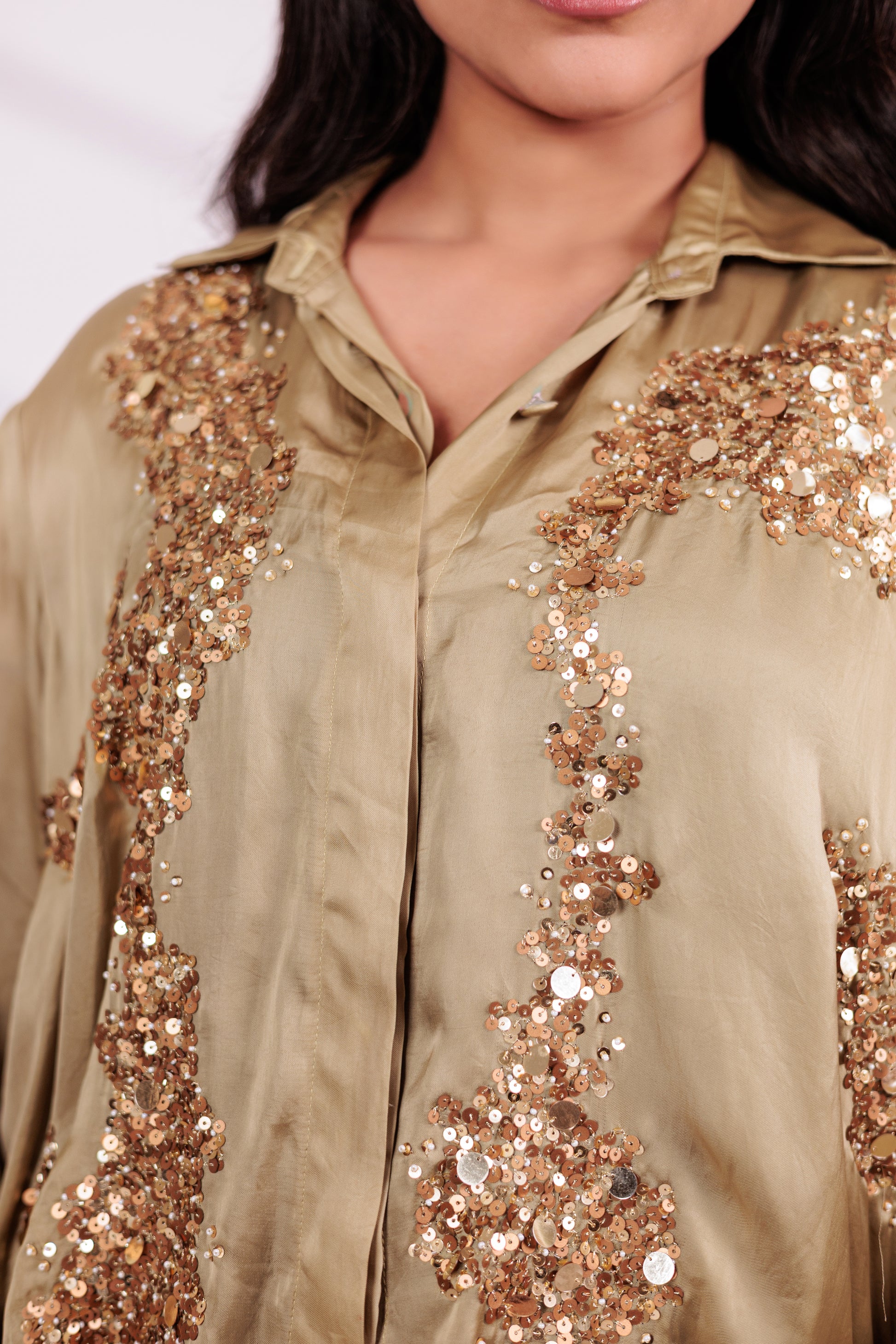 Ali features a classic button-down shirt with a structured collar, relaxed fit, and intricate embroidery.