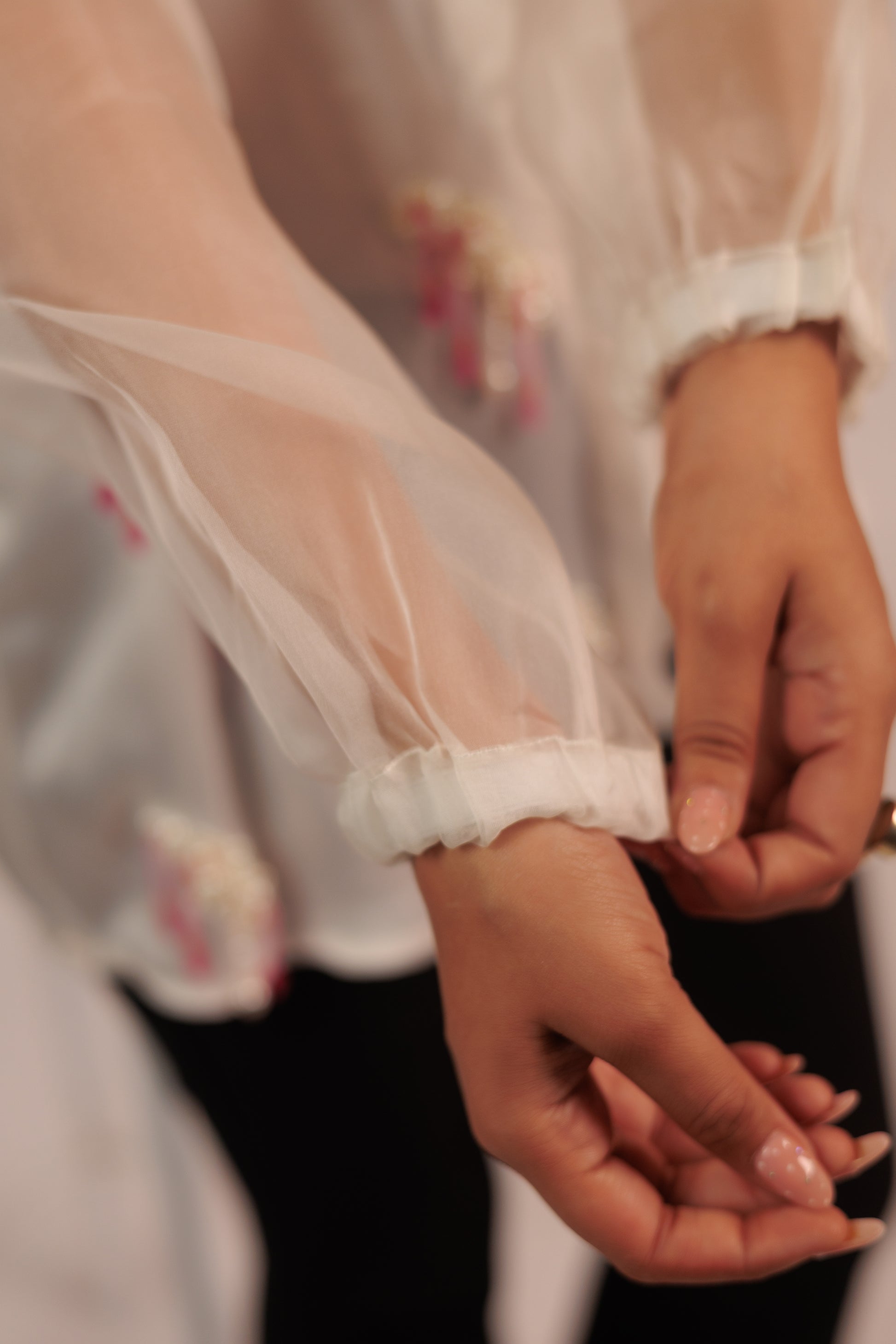 Front button down shirt with hand embellishments in front and back with half organza sleeves.