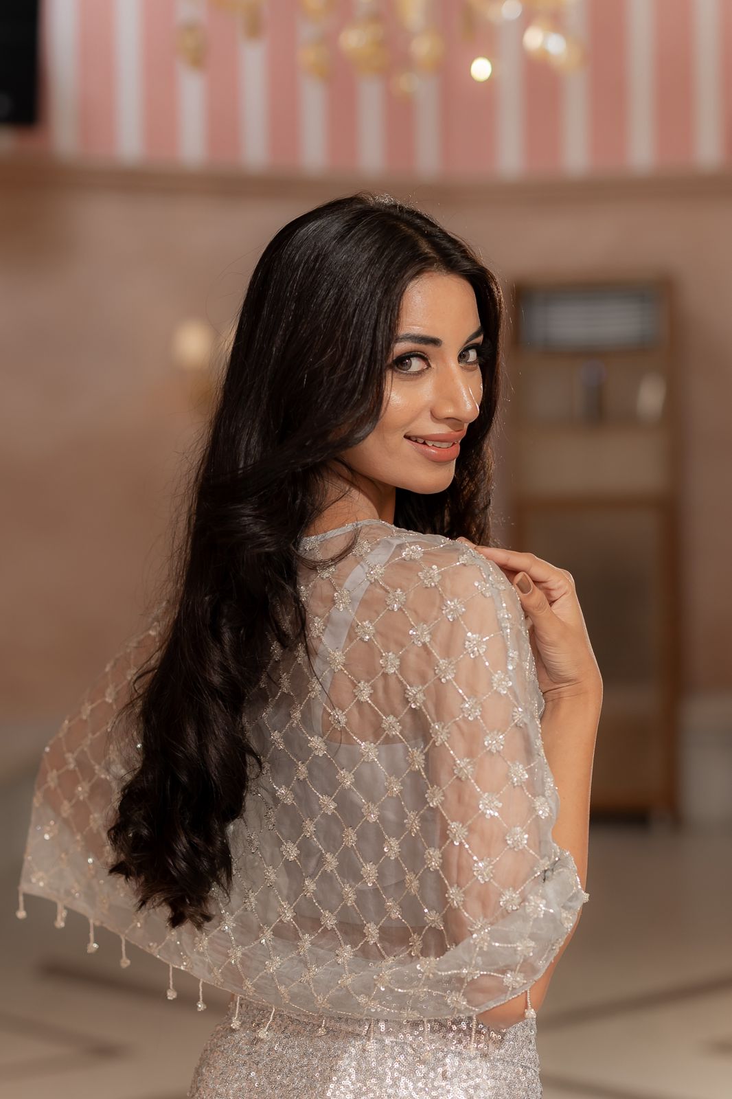 A three-piece set with hand embellished sheer cape layered with bustier, paired with high waist sequin drape skirt.