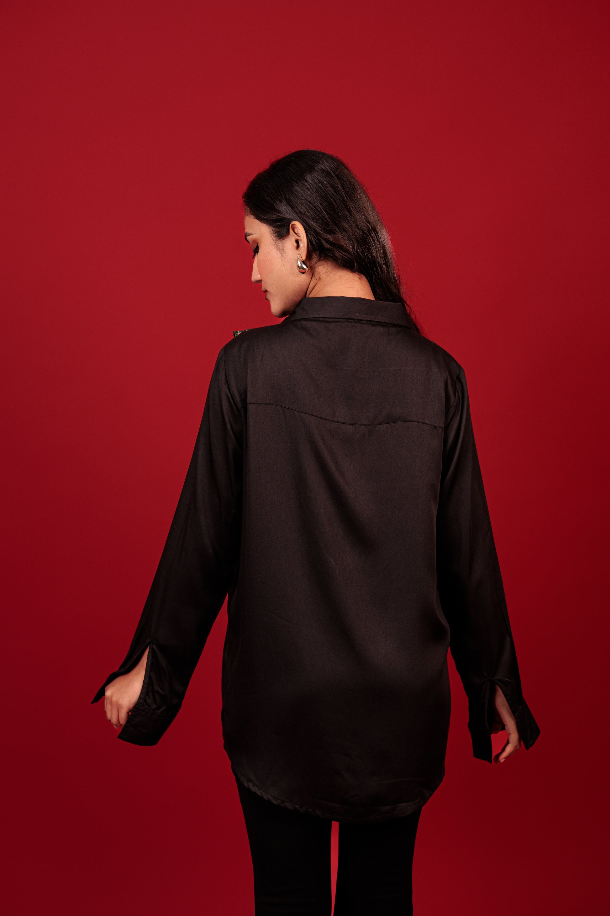 Black base shirt with subtle gold detailing that catches the light with every movement.