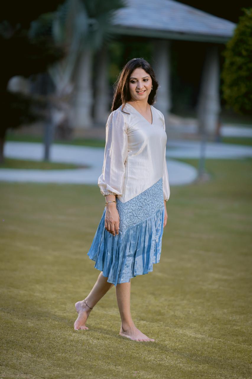 A Tri- Fabric dress with slightly puffed sleeves The bottom part of the dress features quilted pearl embellished fabric and pleated A-line cut hem.